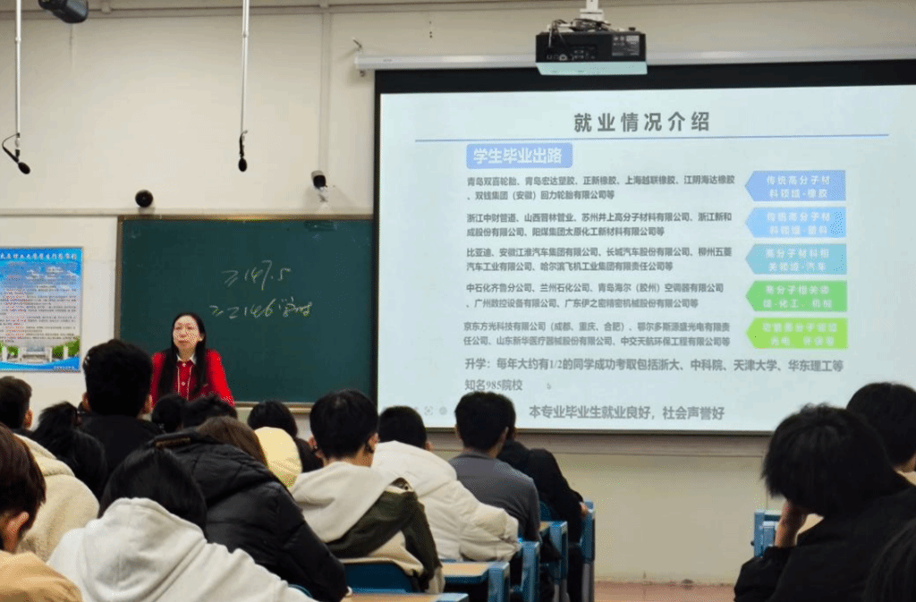 高分子材料与工程专业系副主任贾兰副教授、学院督导组组长卫爱丽副教授,为2024级本科生进行了专业宣讲。首先由卫爱丽老师为同学进行了高分子材料与工程专业解说,从专业的培养方案、专业的课程设置方面告诉同学们高分子专业要学什么,通过近几年毕业生详细的就业与考研统计情况让同学们对将来毕业有什么样的出路有了清晰的了解。接下来贾兰老师介绍了高分子材料学科的发展历史以及高分子材料的前沿应用,让同学们了解了高分子材料在整个社会与经济发展中的重要作用,激励同学们认真学习,勇攀高峰。并且告知了同学学校的专业导师计划,专业课教师都会为同学学习与生活中的问题解答疑惑。最后研二的研究生白晋分享了自身的求学经历以及研究生阶段研究方向,以自身的经验告诉同学们在未来的考研准备过程中如何根据自己的目标制定计划以及一些注意的方面。宣讲会过程中同学们都认真倾听,会后同学表示受益匪浅,对大学生活不再那么迷茫。