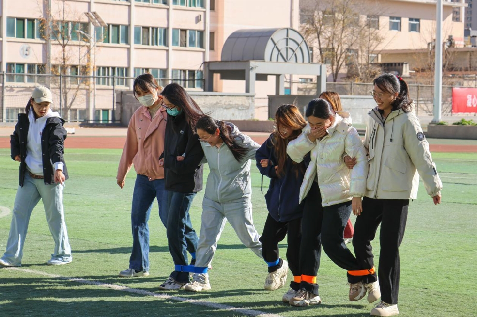 “六人七足”是培养舍友默契的试金石,宿舍6位成员步伐一致,相互协调,共同向终点冲去,进一步增强宿舍成员间的团队意识;“默契大挑战”如同一场热闹的头脑风暴聚会,宿舍成员分成二人组和四人组,一组通过语言描述、动作比划传达信息,另一组负责猜答案,舍友间的默契大配合,提升舍友间的沟通理解能力,让彼此的心靠得更近,使宿舍氛围更加和谐温暖;“限时挑战”是对宿舍团队协作的极限冲锋,宿舍六个人限时180秒,依次完成捏鼻子大象转、手指对手指、叠衣服、穿针、扔水瓶、跳大绳的任务,它培养了同学们在高压环境下的协作能力和应变能力,让大家明白每个成员在团队中的重要性,增强集体责任感;“拍上运球”像一座考验耐心与协作的桥梁,六位成员分两组,相对而站,间隔5m左右,按顺序用乒乓球拍运球至对面,依次完成接力,锻炼大家的专注力和团队协作的稳定性,让大家明白了在团队活动中保持耐心、稳中求进的意义。
