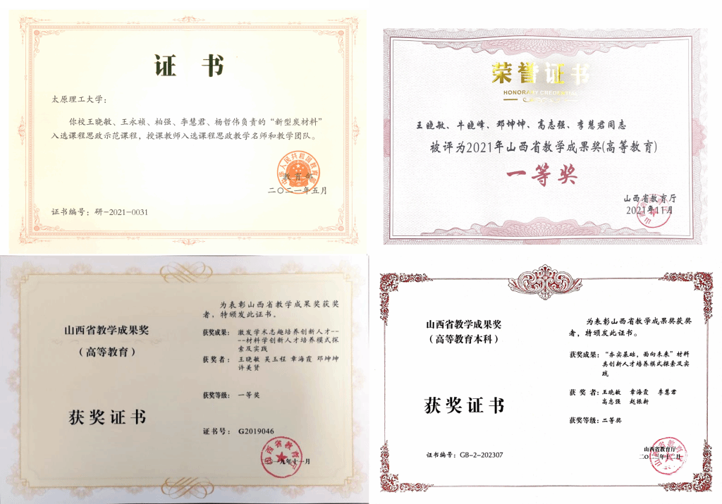 获批教育部课程思政教学团队1个,荣获省级教学成果一等奖2项、二等奖2项,省级一流课程7门,省级教改项目10余项,出版教材2部;获批省级技术创新中心1个、创新团队3个,省级重点实验室2个,荣获省科技奖8项,授权发明专利50余项,发表高水平论文500余篇。目前,承担国家自然科学基金、国家重点研发计划子课题、山西省自然科学基金、省级攻关项目等20余项,横向合作项目30余项。